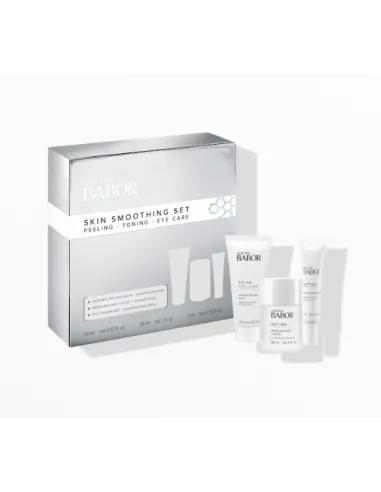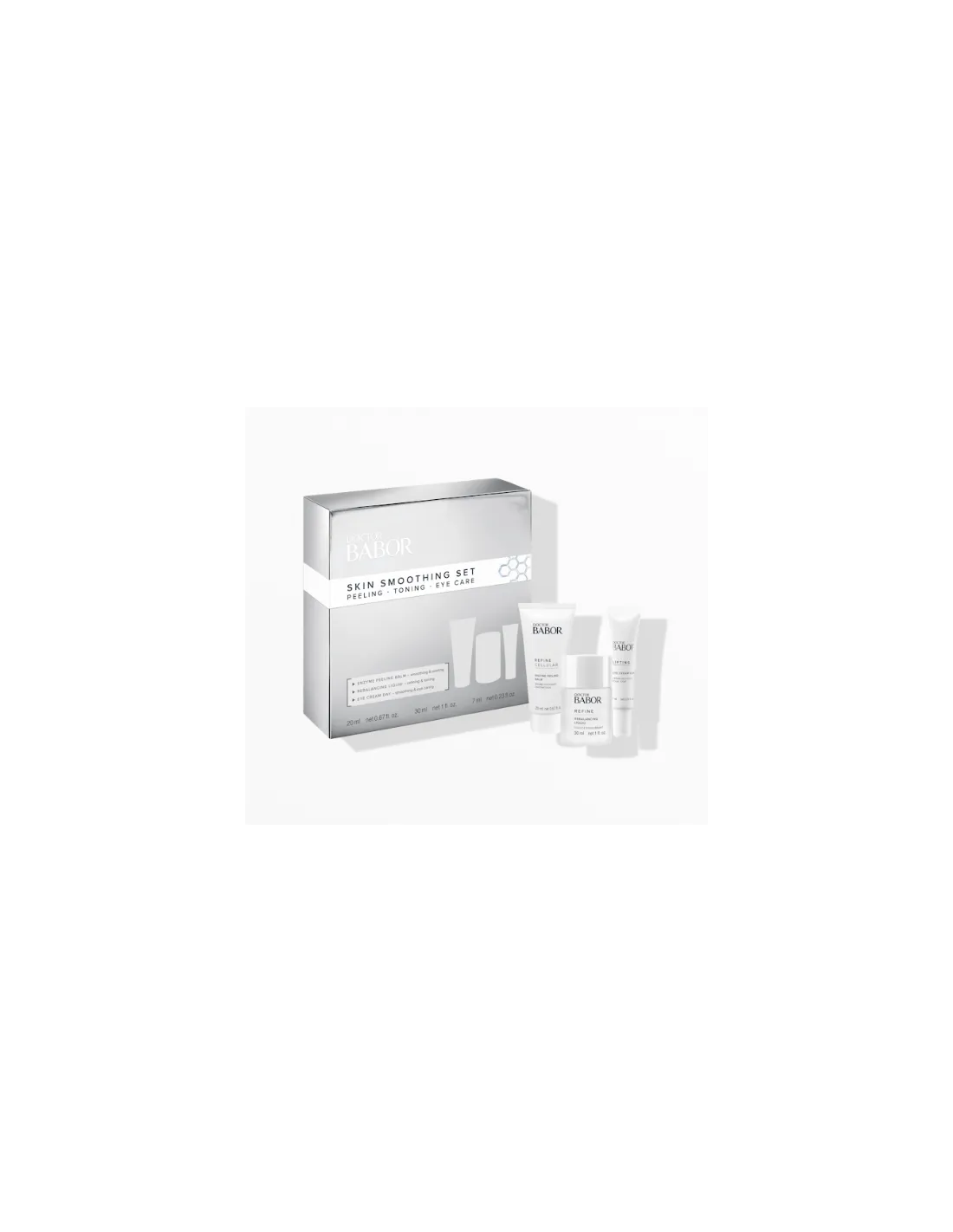 El Skin Smoothing Set de Doctor Babor es una rutina facial completa en tamaño práctico que combina limpieza exfoliante, tonificación calmante y cuidado del contorno de ojos. Ideal para pieles sensibles, con falta de luminosidad o con primeros signos de envejecimiento.
