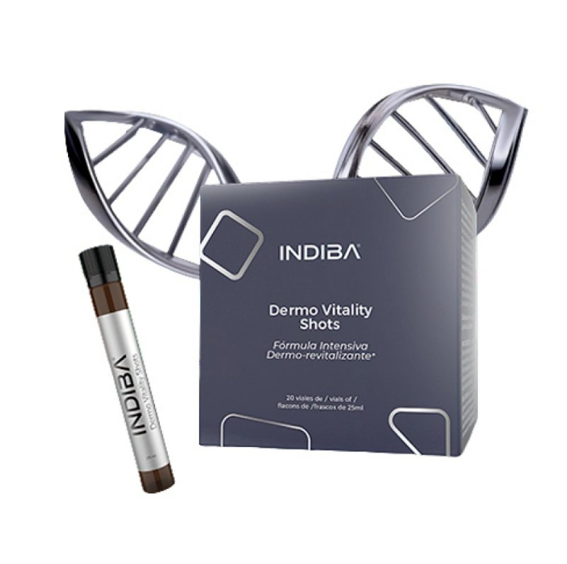 Dermo Vitality Shots de Indiba Ceuticals es un complemento nutricosmético formulado para ayudar a reafirmar, redensificar y revitalizar la piel desde el interior, contribuyendo a mejorar su aspecto, elasticidad y luminosidad.