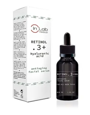 Serum facial con Retinol y Ácido Hialurónico, que estimula la regeneración celular.