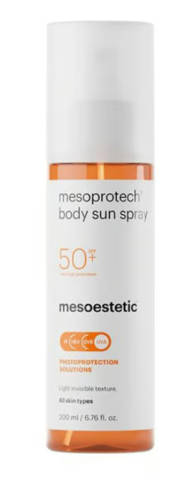 Mesoprotech Body Sun Spray SPF 50+ de Mesoestetic es un protector solar corporal en formato spray, diseñado para ofrecer fotoprotección muy alta (SPF50+) frente a las radiaciones UVA, UVB, IR y luz azul (HEV).