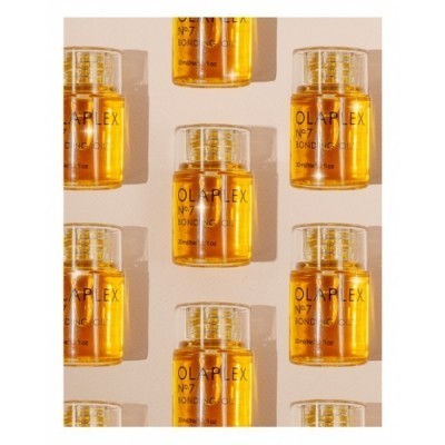 - Una vez seco el cabello con secador, planchas, etc.. utiliza Olaplex nº7 Bonding Oil. Quita la tapa y gira la botella boca abajo, golpea suavemente la parte inferior del envase para dispensar una gota dosificada. Aplica una pequeña cantidad del aceite reparador en las puntas.