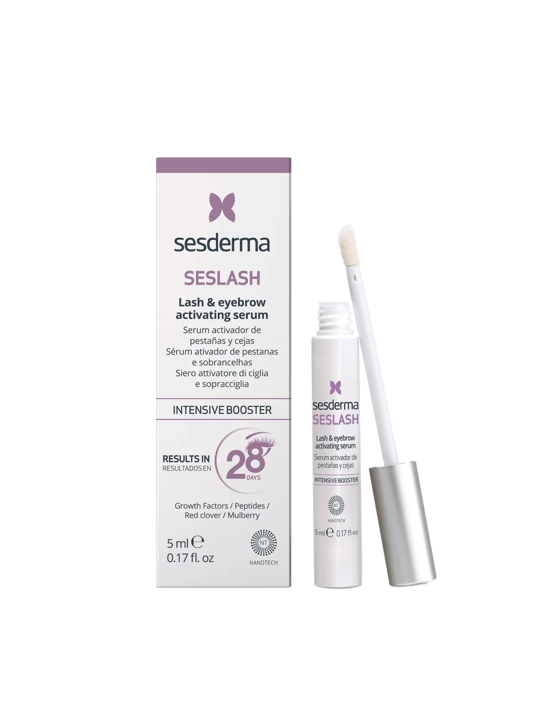 Sesderma Seslash es un tratamiento cosmético formulado para estimular, alargar y fortalecer las pestañas y cejas, mejorando visiblemente su densidad y longitud en pocas semanas. Gracias a su tecnología basada en factores de crecimiento, péptidos y ácido hialurónico, reactiva el folículo piloso y prolonga la fase de crecimiento natural del pelo.