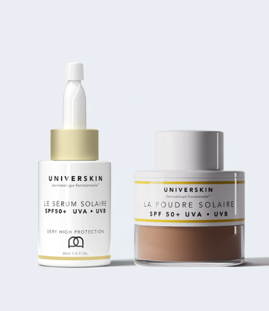 Pack Duo Glow & Go: Serum SPF50 (tamaño viaje o estándar) + Polvo solar compacto.